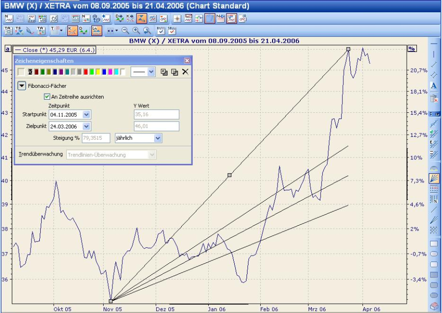 Zeichnen Sie den Fibonacci-Fächer ein, indem Sie eine Trendlinie zwischen zwei Extrempunkte im Kursverlauf einzeichnen. Dabei wird eine "unsichtbare" vertikale Linie durch den zweiten Extrempunkt gezogen und wie oben beschrieben drei Trendlinien gezeichnet.