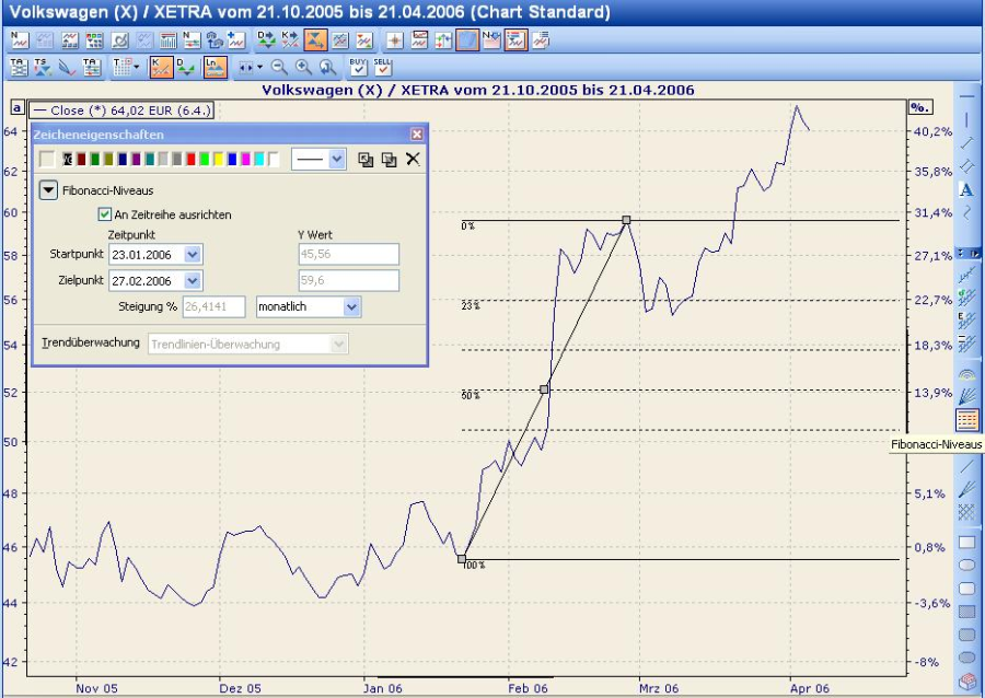 Im Dialogfenster "Zeicheneigenschaften" geben Sie ggf. den genauen Start- und Zielpunkt ein. Außerdem sehen Sie hier die prozentuale Steigung im gewählten Intervall (jährlich, monatlich oder täglich). Die Trendlinie wird abschließend wieder entfernt.