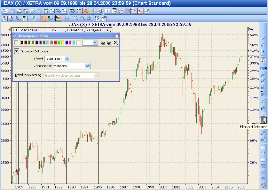 Fibonacci-Zeitzonen sind eine Anzahl vertikaler Linien. Sie werden in den Chart eingezeichnet, indem Sie mit der Maus auf den Startpunkt für die erste Zeitzone klicken. Die Zeitzonen werden eingezeichnet und haben die Abstände der Fibonacci-Intervalle von 1, 2, 3, 5, 8, 13, 21, 34 usw.