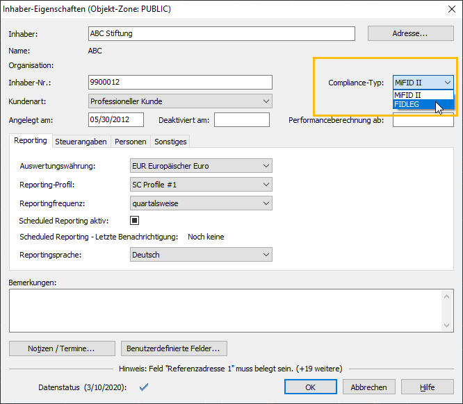 In den Inhaber-Stammdaten finden Sie die folgende Auswahlliste "Compliance-Typ":