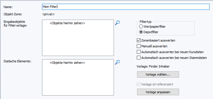 Im Depotfilter ist zusätzlich das Kontrollkästchen "Zonenbasiert auswerten" enthalten. Es gilt nicht für Wertpapiere, da diese nicht zonenbasiert sind.