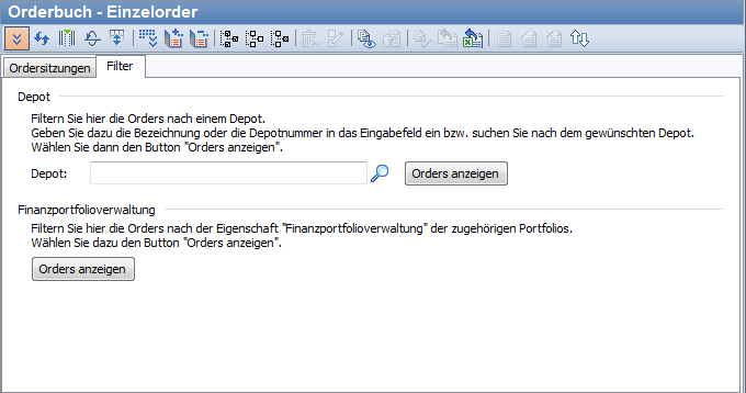 Neben den Anzeigeoptionen für die Orders ausgewählter Ordersitzungen können Sie weitere Filtermöglichkeiten nutzen. Sie können die Orders eines bestimmten Depots oder alle Orders unter Finanzportfolioverwaltung anzeigen.