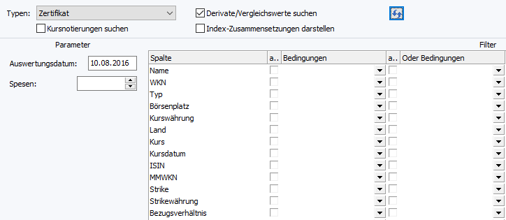 Öffnen Sie ggf. das Parameter- und Filterfeld mit dem Icon "Parameter- und Filtereinstellungen anzeigen" oder mit der Tastenkombination <STRG>+<A>. Das Parameter- und Filterfeld ist dynamisch, d. h., es verändert sich je nachdem, welche Einstellungen Sie in der Tabelle vorgenommen haben (z. B. welche Spalten angelegt wurden).