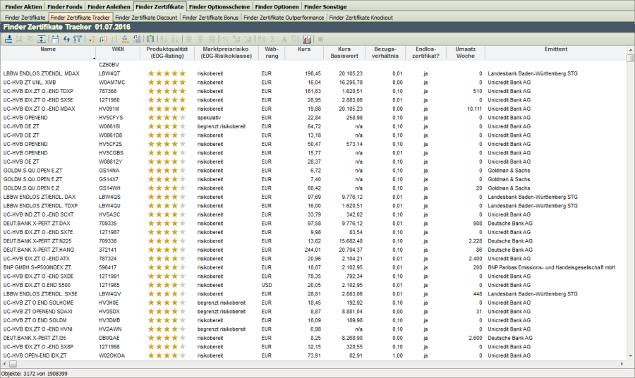 Der "Finder Zertifikate Tracker" ist eine für die Suche nach diesen Zertifikaten optimierte Tabelle, mit der Sie über die Filtereinstellungen individuelle Suchanfragen konfigurieren können. In geöffneten Wertpapierfindern ist der "Finder Zertifikate Tracker" auf dem Worksheet "Finder Zertifikate" abgelegt.