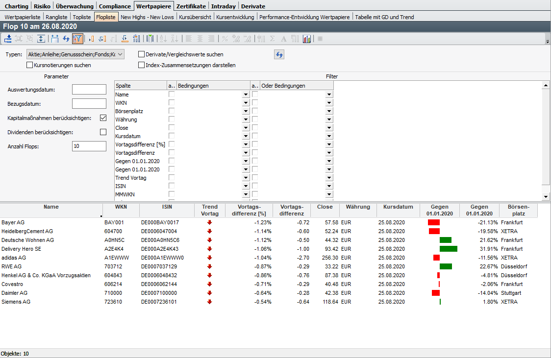 Die Flopliste ist eine Rangliste, die nur die gegenüber dem Vortag am schlechtesten performenden Wertpapiere des Eingabeobjekts auflistet. Dabei können Sie die Anzahl der Flops über die Parameter einstellen. In der Titelleiste der Flopliste sehen Sie die aktuell eingestellte Anzahl sofort.