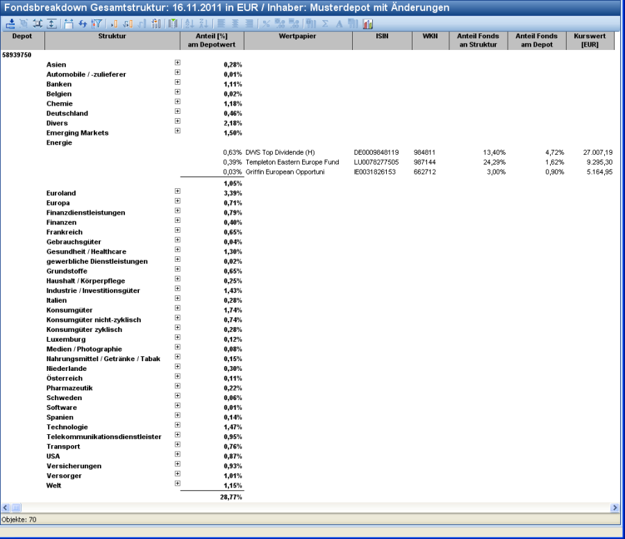 Sie öffnen die Auswertung (im Auslieferungszustand) in den Workspaces von Gruppen, Inhabern, Portfolios oder Depots über die Worksheets "Vermögen", "Fondsbreakdown", "Gesamtstruktur". Zunächst ist in der "zugeklappten" Ansicht nur der kumulierte prozentuale Anteil am Depotwert für die Länder und Branchen von Interesse.