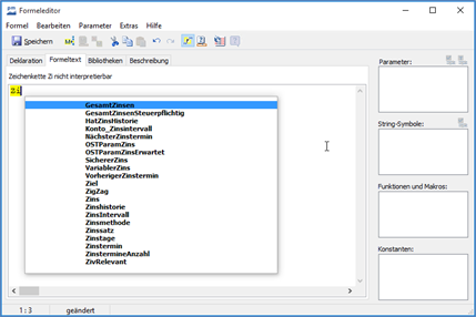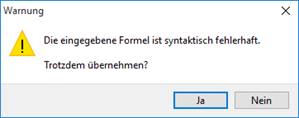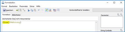 Ist der Formeltext fehlerhaft, erscheint eine entsprechende Meldung in der Statuszeile auf der Registerkarte "Formeltext" (z. B. "Zeichenkette nicht interpretierbar"). Enthält der Formeltext mehrere Fehler, wird jeweils nur der erste Fehler angezeigt.