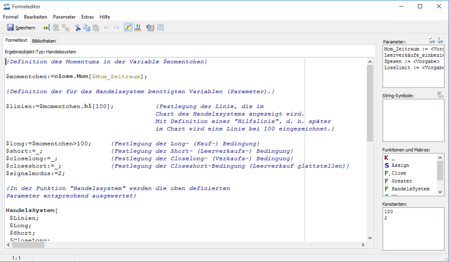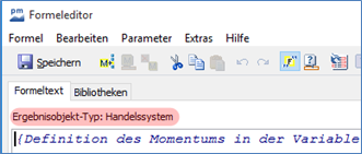 Auf der Registerkarte "Formeltext" können Sie eine neue Formel eingeben oder eine bestehende Formel bearbeiten. Um die Lesbarkeit zu verbessern, werden alle Formeln und Makros im Formeltext fett dargestellt, Variablen erscheinen in grüner Schrift, Kommentare in blauer Schrift. Speichern Sie die Formel anschließend ab; der Formeleditor wird beim Speichern über den Button "Speichern" oder die Tastenkombination <STRG>+<S> dann automatisch geschlossen. Beim Speichern über die Tastenkombination <STRG>+<W> bleibt der Formeleditor geöffnet.