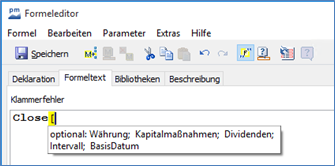 Wenn Sie bei der Formeleingabe nach einer Funktion eine runde "(" oder eckige "[" Klammer öffnen, wird als Hilfestellung die Parameterliste dieser Funktion eingeblendet.