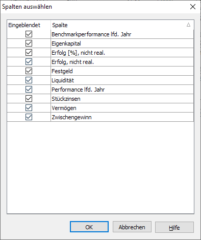 Ein-/Ausblenden | Wählen Sie diesen Befehl, um Spalten im Dialogfenster "Spalten auswählen" ein- oder auszublenden.