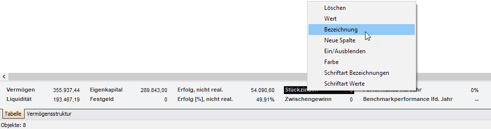 Die Fußzeilen der Tabellen und Diagramme können Sie über die jeweiligen Befehle im Kontextmenü der Fußzeile ändern.