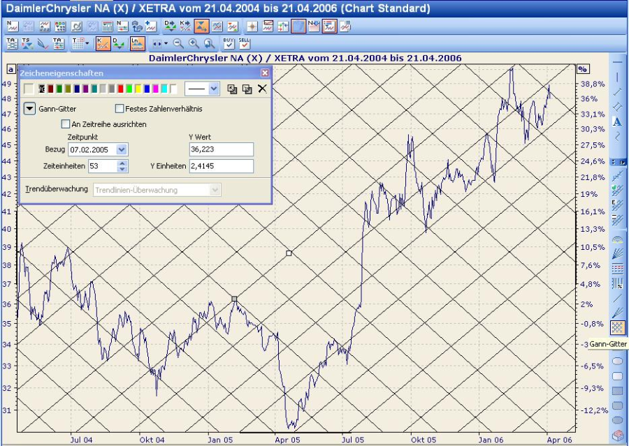 Klicken Sie auf das Icon "Gann-Gitter".- Zeichnen Sie das Gann-Gitter ein, indem Sie mit der Maus auf den Bezugspunkt im Kursverlauf klicken.