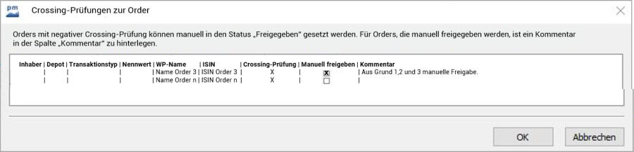Orders mit negativer Crossing-Prüfung können hier manuell mit dem Status "Freigegeben" versehen werden. Dazu muss in die Spalte "Kommentar" ein Text eingegeben werden.