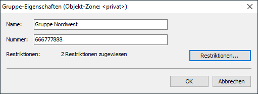 Hier sehen Sie die Anzahl der zugewiesenen Restriktionen auf Gruppenebene. Wählen Sie den Button "Restriktionen…" rechts daneben, um der Gruppe Restriktionen zuzuweisen bzw. diese zu bearbeiten.