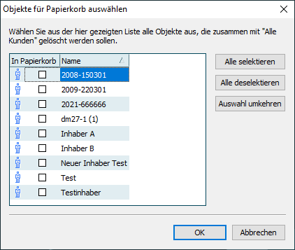 Aktivieren Sie hier die Objekte, die mit der Gruppe gelöscht werden sollen.