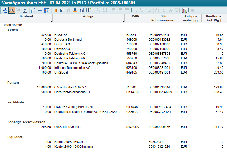 Im Beispiel oben sehen Sie die Vermögensübersicht, die standardmäßig nach den Spalten "Depot" und "Assetklasse" gruppiert ist.