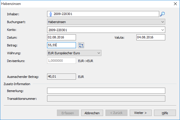 Geben Sie hier das Datum der Habenzinsen an. Voreinstellung ist das aktuelle Datum. Sie können das Datum ändern, um z. B. nachträglich Buchungen vorzunehmen.
