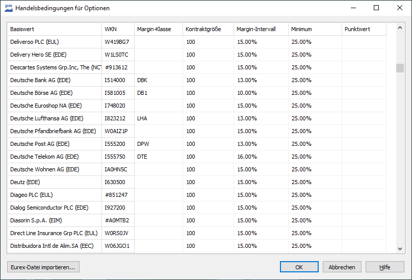 Margin-Klasse | Margin-Klassen-Kürzel der Eurex für den Basiswert. Dieses wird für den Import der Eurex-Marginparameter-Datei benötigt. Tragen Sie deshalb für Ihre Basiswerte hier zunächst unbedingt die Kürzel ein (z. B. "DTE" für die Deutsche Telekom AG oder "ESX" für den Euro Stoxx 50). Hier sei auf die Produktinformationen der Eurex verwiesen. |