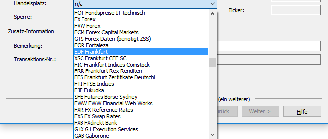 In den Dialogfenstern zum Erfassen von Orders können Sie aus einer Liste mit allen Handelsplätzen denjenigen Platz auswählen, an dem Sie das Wertpapier gekauft haben. Der Handelsplatz wird mit der Order zu Informationszwecken gespeichert (unabhängig von dem Platz, der im Wertpapier bzw. in der jeweiligen Kursnotiz hinterlegt ist) und ist eine MiFID-Anforderung.