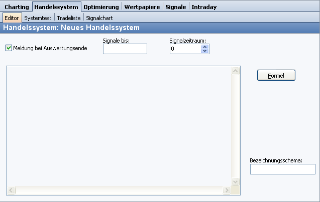 Handelssysteme werden in Formeln durch den Operator HandelsSystem spezifiziert. Als Parameter sind die Anzeigelinie, die Signalspezifikation und die Parameter für die Signalinterpretation und Performancebewertung anzugeben.