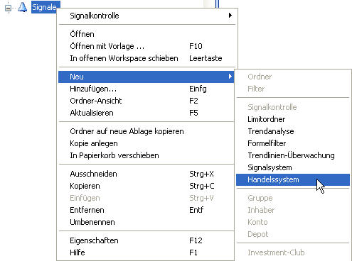Oder legen Sie das neue Handelssystem unter einem bereits vorhandenen Signalordner bzw. Ordner an. - Markieren Sie die Signalkontrolle mit der rechten Maustaste und wählen Sie im Kontextmenü den Befehl NEU, HANDELSSYSTEM.
