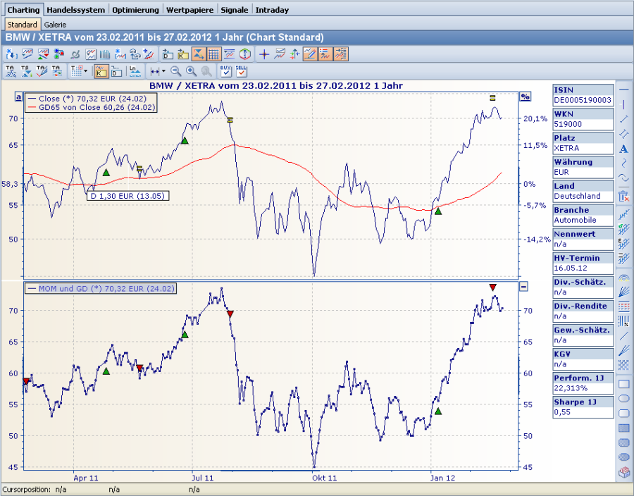 Wählen Sie ein Handelssystem aus der Liste aus. Das Handelssystem wird dann in einem neuen Diagramm im Chartfenster eingezeichnet. Die Handelssignale werden auch im Kursverlauf eingeblendet, sofern dem Kursverlauf bisher kein anderes Handelssystem zugeordnet war.