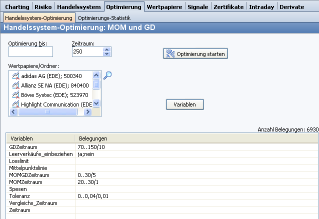 Für die Optimierung von Handelssystemen nehmen Sie folgende Einstellungen vor: