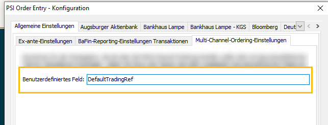 Geben Sie dazu im Dialogfenster "PSI Order Entry - Konfiguration" den Namen des dafür angelegten benutzerdefinierten Feldes in das Eingabefeld "Benutzerdefiniertes Feld" auf der Registerkarte "Allgemeine Einstellungen", "Multi-Channel-Ordering-Einstellungen" ein.