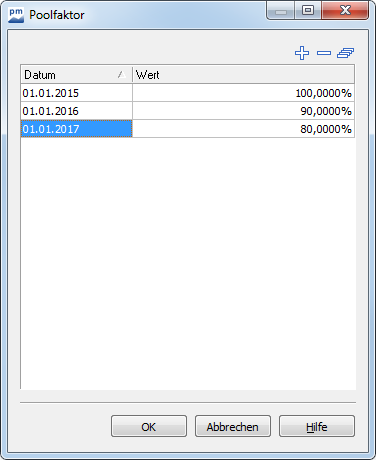 Neben der in Beispiel 1 beschriebenen Zins-Historie können Sie für Poolfaktoranleihen auf der Registerkarte "Erweitert" in den Anleihe-Stammdaten auch die Historie für die Poolfaktoren der Anleihe eingeben. Aktivieren Sie dazu das Kontrollkästchen "Anleihe hat Poolfaktor" und geben Sie dann über das Icon "Poolfaktoren erfassen" die Historie ein.