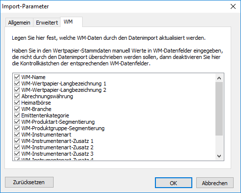 Haben Sie in den Wertpapier-Stammdaten manuell Werte in WM-Datenfelder eingegeben, die nicht durch den Datenimport überschrieben werden sollen, dann deaktivieren Sie hier die Kontrollkästchen der entsprechenden WM-Datenfelder und bestätigen Sie die Einstellungen mit "OK".