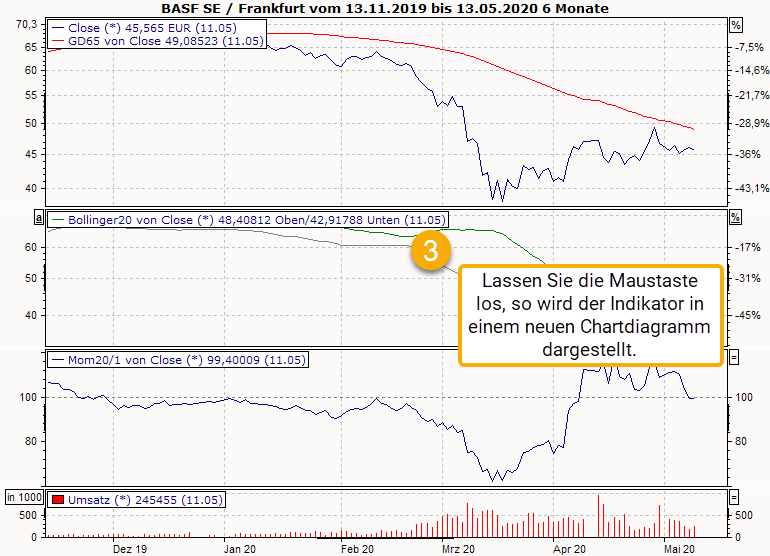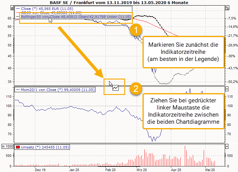 Um einen Indikator in ein anderes Diagramm des Chartfensters zu verschieben, markieren Sie den Indikator und ziehen Sie ihn (bei gedrückter linker Maustaste) an die gewünschte Position.