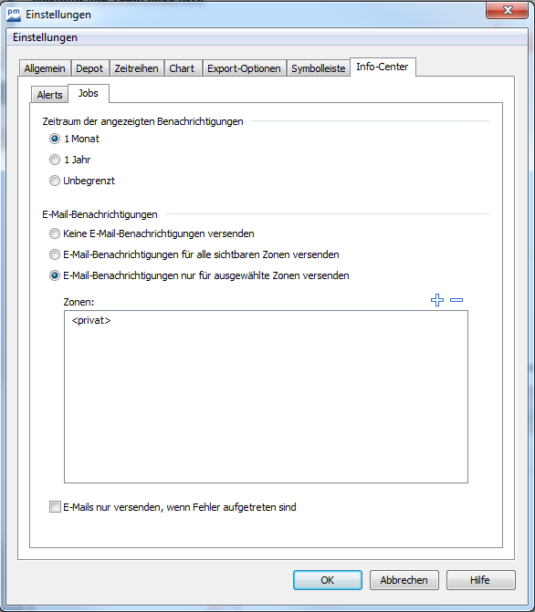 E-Mails nur versenden, wenn Fehler aufgetreten sind | Aktivieren Sie dieses Kontrollkästchen, wenn Sie bei Jobs nur im Fehlerfall auch per E-Mail benachrichtigt werden wollen. Diese Einstellung ist nicht verfügbar, wenn Sie oben die Option "Keine E-Mail-Benachrichtigung versenden" gewählt haben. |