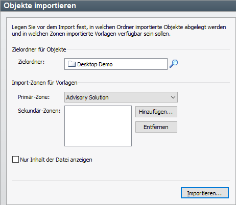 Die Import-Zonen für Vorlagen hingegen sind für die zu importierenden Datensätze wie Vorlagen sowie ggf. Bibliotheken und Aktivitätsdefinitionen relevant. Hier wird empfohlen, eine eigene Vorlagen-Zone für die Daten der Infront Advisory Solution zu verwenden.