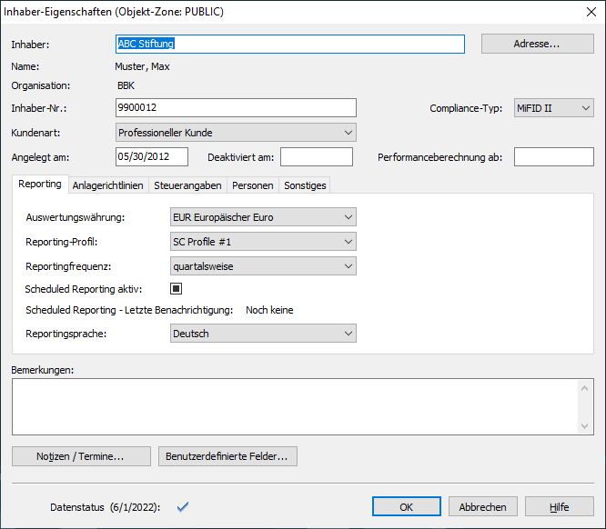 Hier können Sie das Datum eintragen, an dem Sie den Inhaber angelegt haben. Standardeinstellung ist das aktuelle Datum.