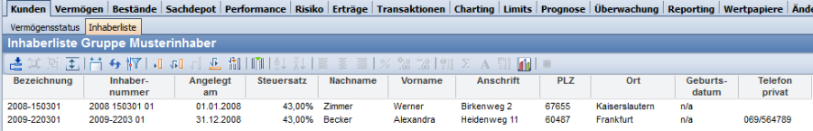 Im Workspace von Gruppen finden Sie auf dem Worksheet "Kunden" die Inhaberliste, die alle Inhaber auflistet, die zur aktuell ausgewählten Gruppe gehören.
