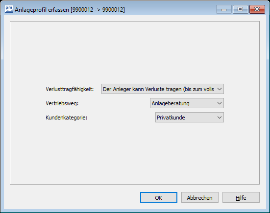 - Ändern Sie im erscheinenden Dialogfenster "Anlageprofil erfassen" dann die gewünschten Werte für die Kriterien "Verlusttragfähigkeit", "Vertriebsweg" und/oder "Kundenkategorie" aus und speichern Sie die Auswahl mit "OK".