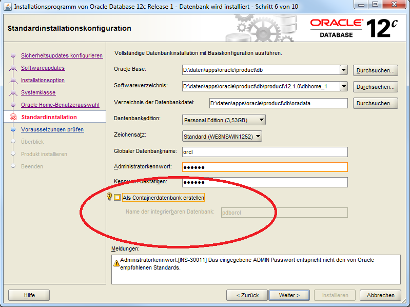 Die Verwendung von Containerdatenbanken wird nicht unterstützt. Falls Sie Oracle 12c einsetzen, achten Sie bei der Konfiguration darauf, dass das Kontrollkästchen "Als Containerdatenbank erstellen" deaktiviert ist: