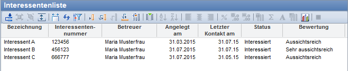 Filtern Sie die Tabelle z. B. nach Interessenten-Bewertung, Betreuer oder "Angelegt am"-Datum der Interessenten. Lesen Sie zu den einzelnen Stammdaten ggf. den Abschnitt Interessenten-Eigenschaften.