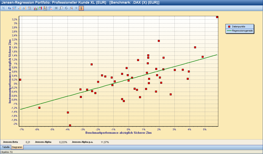 Diese Auswertung liefert sowohl eine Tabelle als auch eine Grafik zur Visualisierung der Jensen-Regression für Portfolios, die sich standardmäßig öffnet. Über die bekannten Registerkarten unten im Auswertungsfenster wechseln Sie zwischen Tabellen- und Grafikansicht. Sie finden die Auswertung in den Workspaces von Inhabern, Portfolios und Depots auf dem Worksheet "Risiko", "Risikokennzahlen".