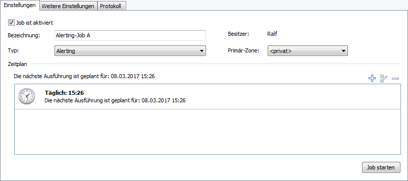 Job ist aktiviert | Aktivieren Sie dieses Kontrollkästchen, um den Job zu aktivieren. Ein Job muss aktiviert sein, damit er ausführbar ist. Das bezieht sich sowohl auf die zeitgesteuerte als auch auf die manuelle Ausführung. |