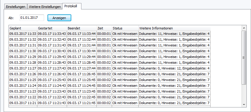Status | Der aktuelle Status der Job-Laufs ("Läuft", "OK", "OK mit Hinweisen", "Abgebrochen" usw.). |