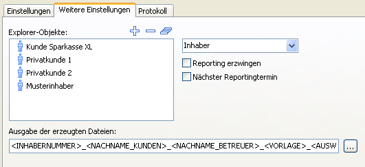 Ausgabe der erzeugten Dateien | Geben Sie hier an, nach welchem Schema die (PDF-)Dateien benannt und wo sie gespeichert werden sollen. Haben Sie in der Konfiguration des Scheduled Reportings einen Drucker ausgewählt, so greift diese Pfadangabe nicht. Lesen Sie dazu auch den Abschnitt Ausgabe der erzeugten Dateien im Kapitel Batch-Export. |