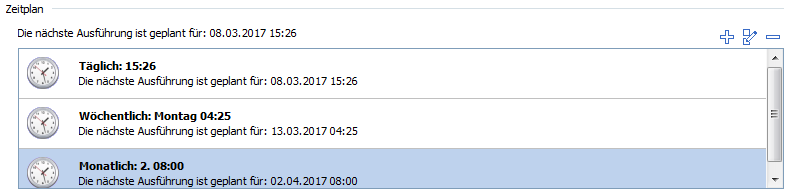 Verfahren Sie analog, wenn Sie für den gleichen Job weitere Startzeitpunkte festlegen möchten. Für jeden Job können theoretisch beliebig viele Zeitpläne angelegt werden. Zu jedem Zeitplan wird die nächste Ausführung angezeigt. Die nächste Ausführung für den Job ist oben im Bereich "Zeitplan" zu sehen. Aktuell deaktivierte Zeitpläne sind inaktiv (ausgegraut).