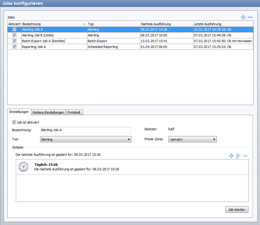 - Im unteren Bereich (Job-Detailansicht) nehmen Sie die Konfiguration des ausgewählten Jobs vor. Weiterhin enthält dieser Bereich im Protokoll Informationen über alle Läufe des Jobs.