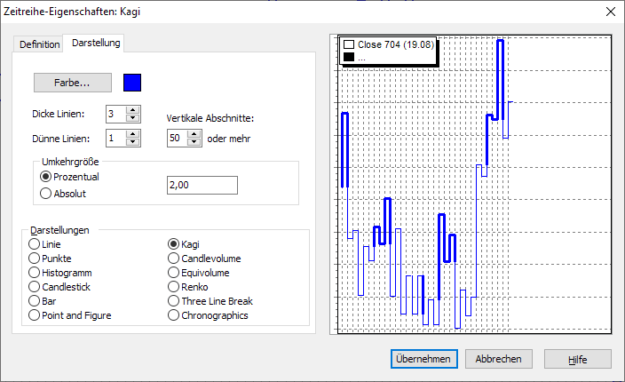 Umkehrgröße | Geben Sie hier den "Reversal Amount" an. Das ist der Betrag, um den sich der Kurs mindestens in die Gegenrichtung bewegen muss, damit in der nächsten Spalte eine neue Kagi-Linie eingezeichnet wird. Die Umkehrgröße können Sie prozentual (Standard) oder absolut angeben. |