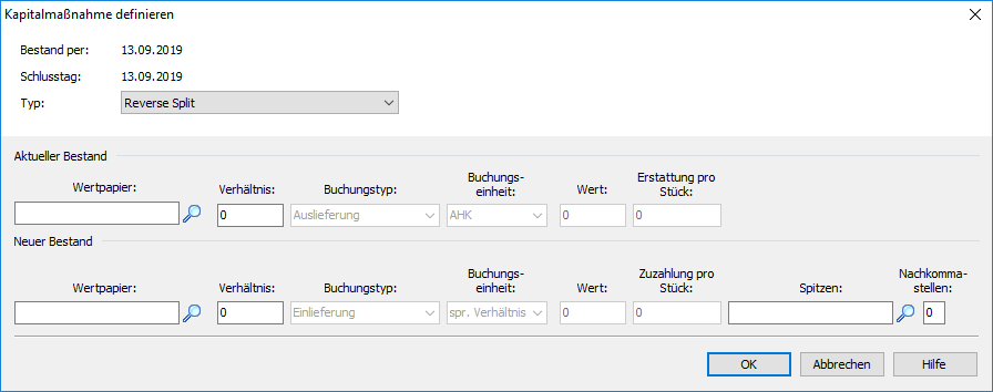 Die einzelnen Eingabe- und Auswahlfelder des Dialogfensters gliedern sich in die Bereiche "Aktueller Bestand" (entspricht Datum des Feldes "Bestand per") und "Neuer Bestand" (also Bestand nach der Kapitalmaßnahme).
