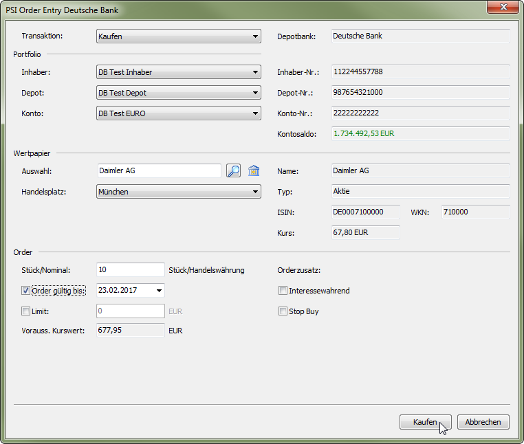 Haben Sie alle Ihre Eingaben im Dialogfenster "PSI Order Entry" gemacht, bestätigen Sie mit "OK".