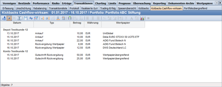 In den Workspaces von Portfolios, Inhabern, Depots oder Gruppen öffnen Sie diese im Auslieferungszustand schnell über das Worksheet "Transaktionen", "Kickbacks Cashflow-wirksam".