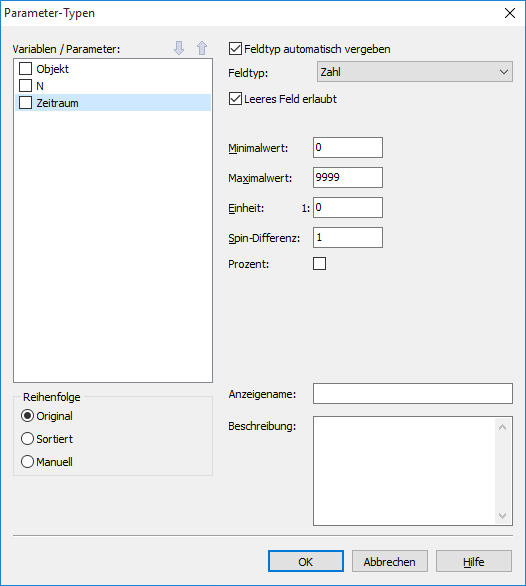 Das Dialogfenster "Parameter-Typen" ist dynamisch, d. h., je nachdem, welche Einstellungen Sie hier vornehmen, erscheinen neue Felder, in denen Sie weitere Angaben machen können.