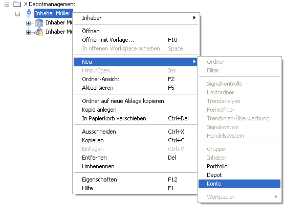 Markieren Sie den Inhaber oder ein Portfolio und wählen Sie im Kontextmenü den Befehl NEU, KONTO. Oder markieren Sie den Inhaber bzw. das Portfolio im Explorer und wählen Sie dann im aufklappenden Menü des Explorer-Icons "Neues Objekt anlegen" den Befehl KONTO.
